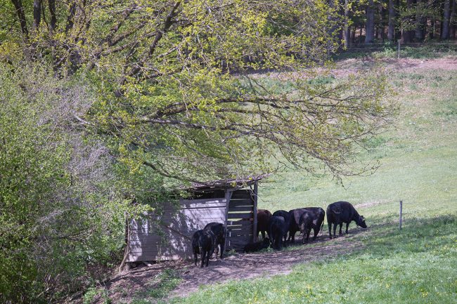 Die hügelige Landschaft sorgt für die sportliche Komponente bei unseren Stauden-Angus. Gerade bei den Kälbern ist der Wechsel zwischen sonnigen Weideflächen und schattigen Waldrandplätzchen sehr beliebt.